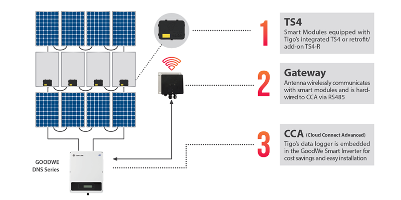 Offering from shutdown code compliance to module-level diagnostics and maximized energy harvest, the Tigo TS4 platformworks seamlessly with both GoodWe DNS and SDT inverters. Compared to other traditional optimization systems in the market which require MLPEs on every module even when it is not necessary, GoodWe offers a highly efficient solution with fewer BOS components which lowers the overall cost of the system and is easier to install.